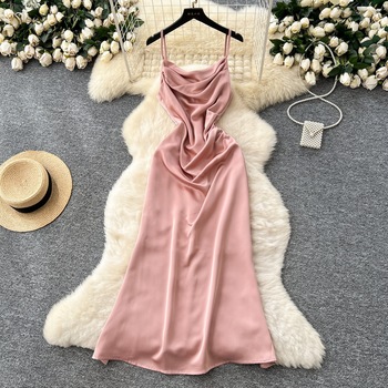 2025 verano nueva moda temperamento sin mangas estilo de vacaciones escote plisado vestido largo asimétrico