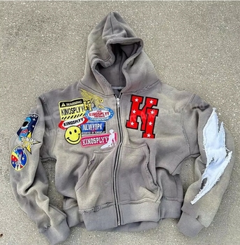 Sweat à capuche brodé avec appliques personnalisées Veste zippée en strass Lavage à l'acide Vintage Washed Men Fleece Streetwear Hoodie