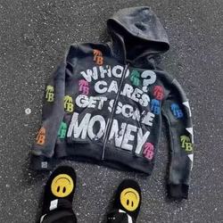 Y2K Cross-border Trendy American-style Printed Pattern Loose and Comfortable Casual Hooded Zipper Retro Hoodie Jacket Top