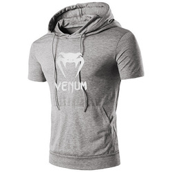 メンズ夏フード付きTシャツルーズ、トレンディなブランド、半袖、スポーティ、フィットネススタイル。