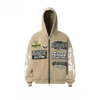 American Retro Distressed Racing Slogan Elements Hooded Sweatshirt for Men Boyfriend Style Zipper Pullover, Washed-out Coat